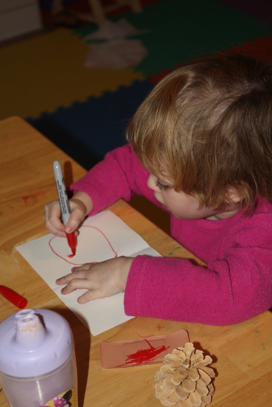 After our failed glitter attempt, we simply used markers. In reflecting, I wish I would have used some fun stickers too - would've added a different "medium" plus peeling stickers is still a little tough for Big Sis but I'm guessing good for those fine motor skills!