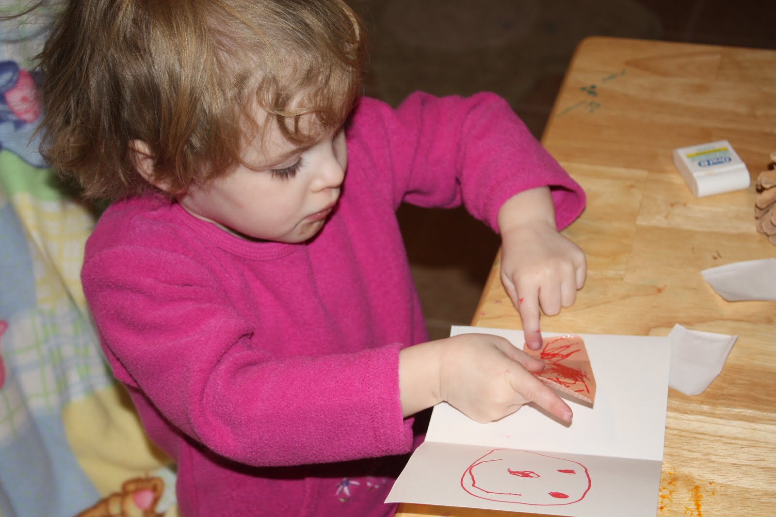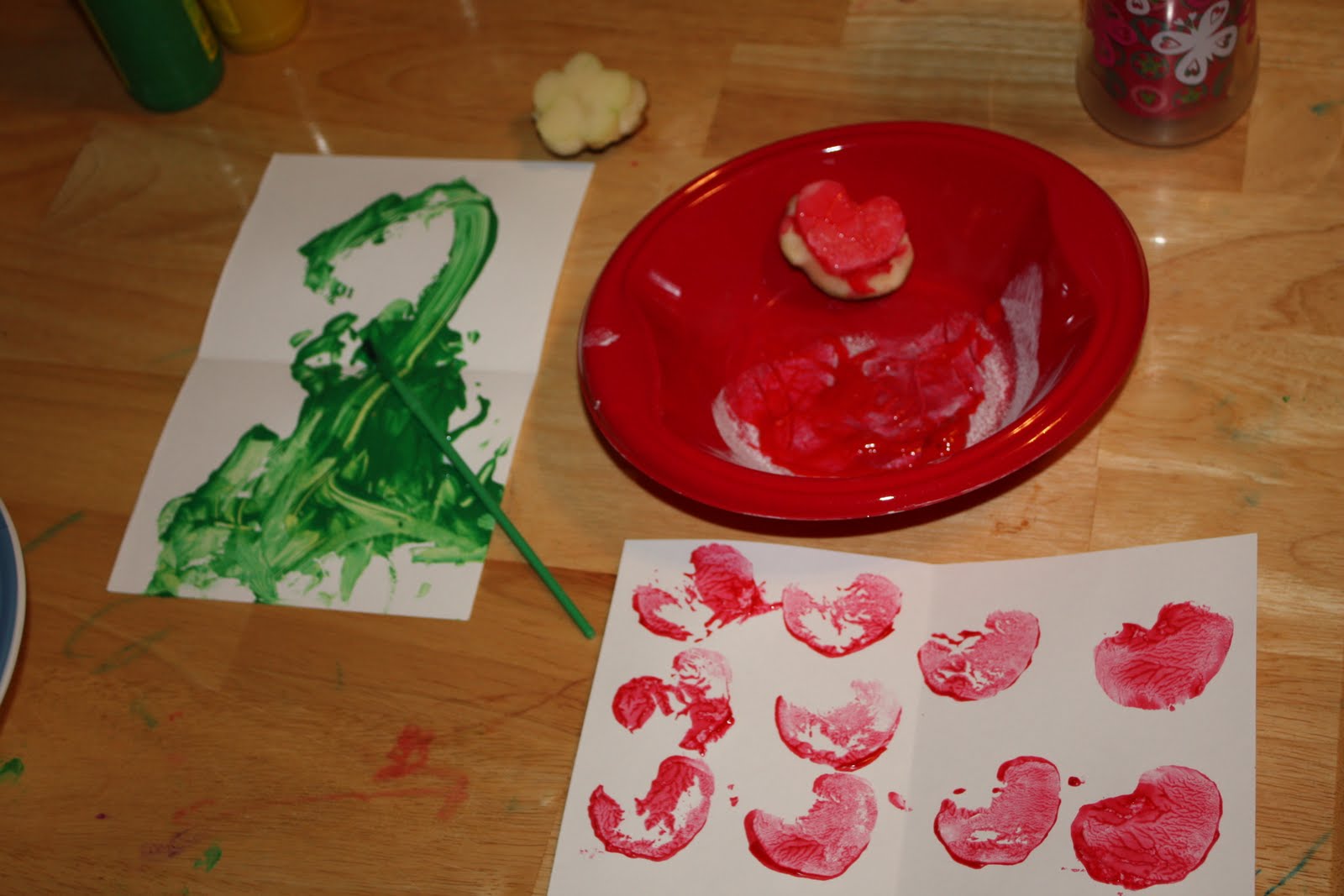 For the second set of cards, I decided to try out potato stamps. We had some potatoes that were too old to eat, but not rotten. I did the first part of the craft - cutting part of the potato into a shape. (I made a flower and a heart...it's not easy to cut, so I tried to pick simple designs). I poured some washable paint on a plate, had the girls dip the stamps in paint and get as much excess paint off as possible, then stamp on their card. Big sis caught on pretty well and filled the inside of her card with red hearts. Little sis didn't quite figure out how to get rid of the extra paint, so she had big green blobs on her card. She quickly wanted to switch over to a paint brush, so the inside of her card is just a random streak of paint.