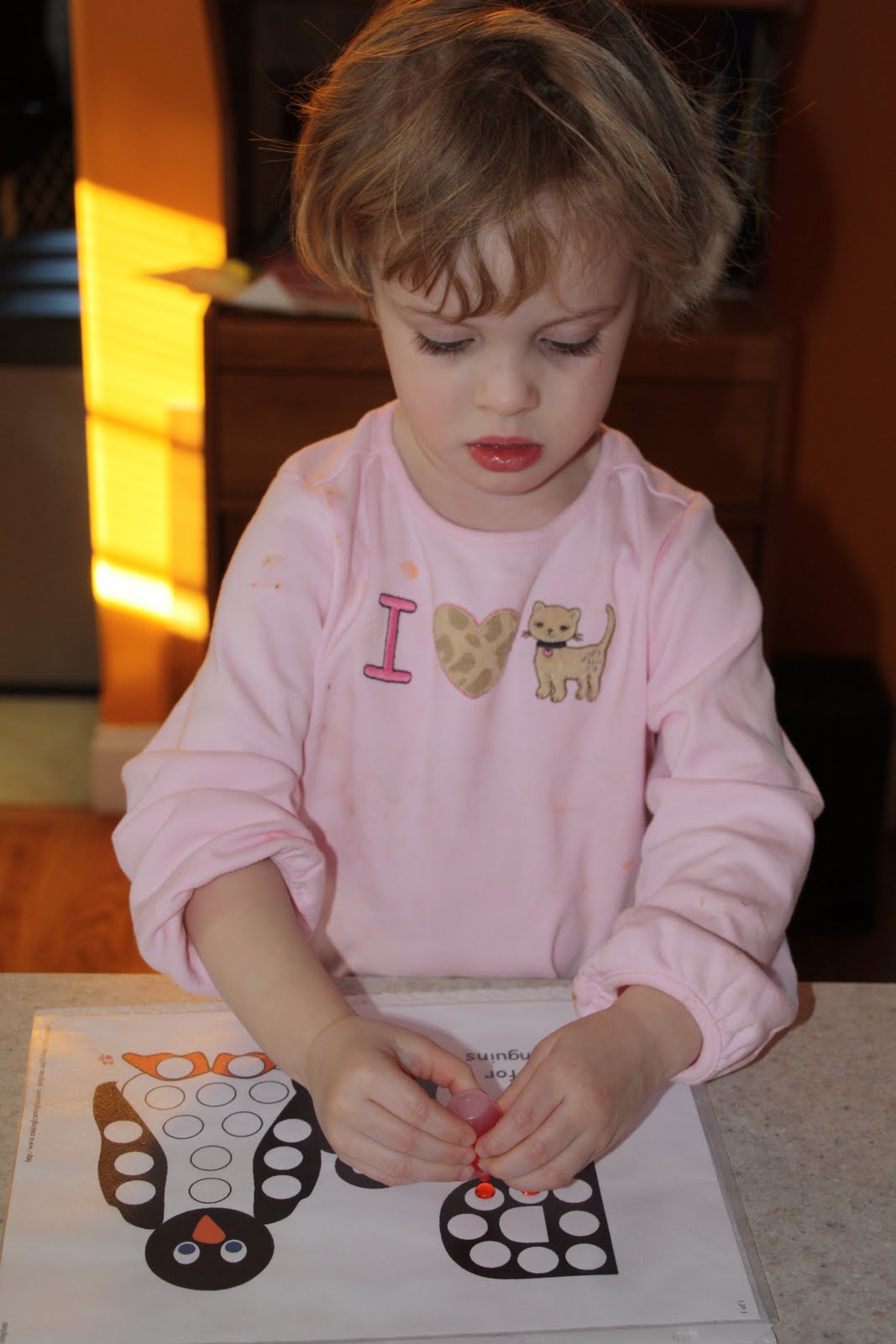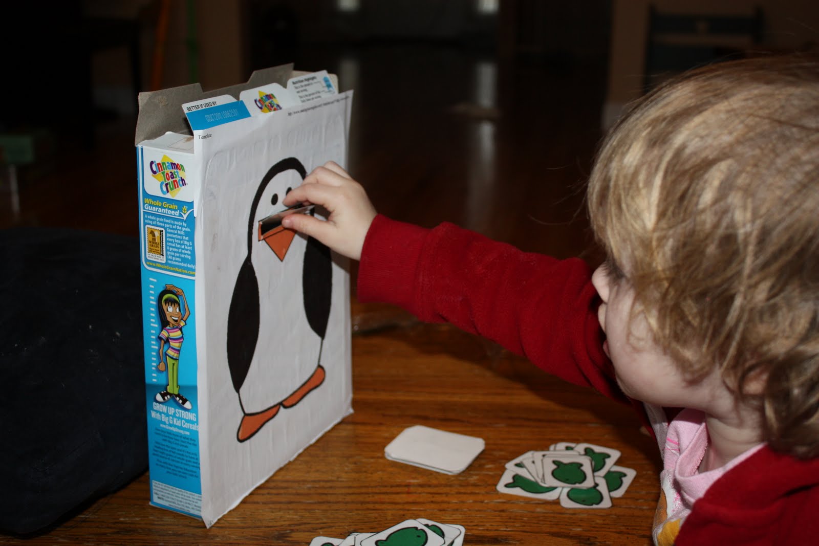 Big sis LOVES LOVES LOVES penguins, so since my creativity seems to have disappeared, I searched various blogs for penguin related crafts and activities. Today, we tried one that I stumbled upon via makinglearningfun.com. I made all the materials ahead of time using the printables on the site (printed all the game pieces on cardstock and laminated using packing tape as it was all I had on hand at the time!).