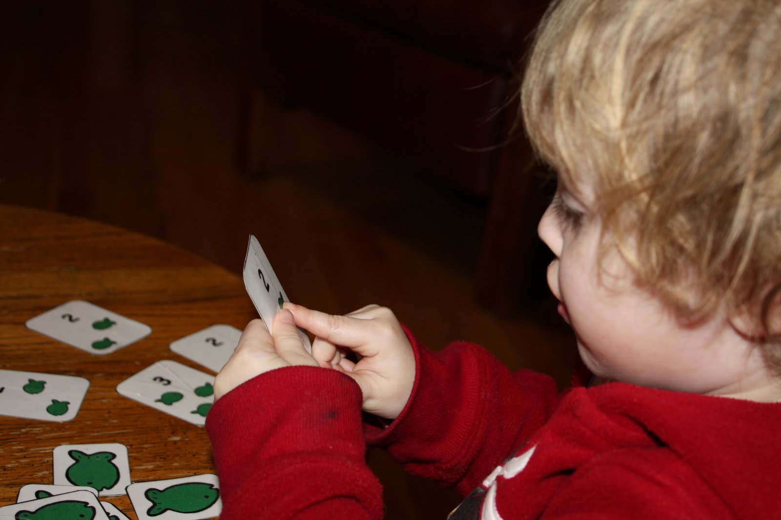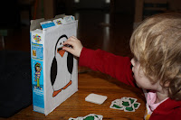 To play the game, we each started out with 15 fish cards. We took turns drawing from the card pile - the cards either showed 1, 2 or 3 fish (both the numeral and a fish representation). Whoever feeds all of their fish to the penguin first is the winner! Big sis loved the game...we didn't play it for terribly long, but I know it will be one she'll go back to for a while!