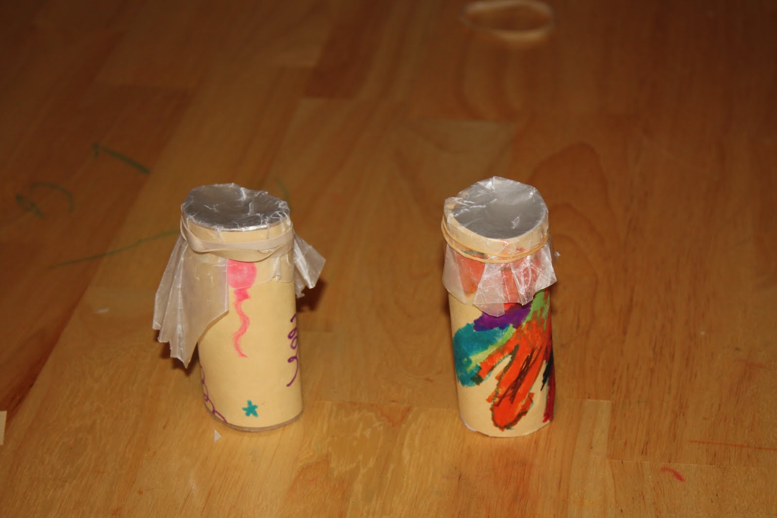 Supplies needed: Empty toilet paper or paper towel holder, wax paper, rubber band, decorating supplies (we used construction paper and markers, but could use foil, torn tissue paper glued to the roll, etc.)