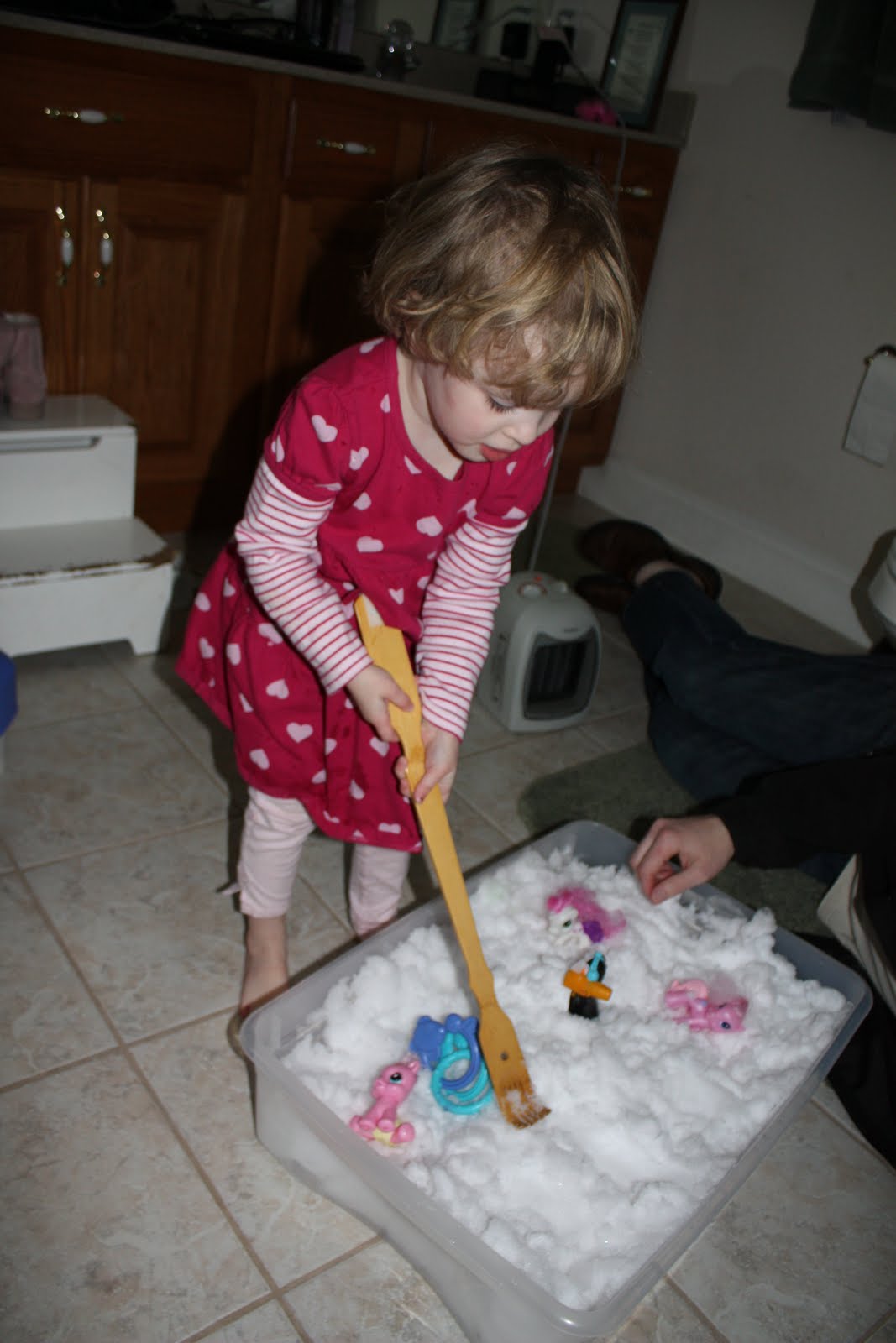 Over at Tired, Need Sleep, I found what I thought to be a great idea! When it is too cold outside, she brought a tub filled with snow inside for some play time! We decided to try this with our girls today, although we didn't pick the best time. Big sis loved it and had lots of fun. Little sis misunderstood...she thought we were going outside and was quite disappointed to learn that we were not! We'll try again soon! Here's an early pic of big sis playing. Later, we brought in some measuring cups and made "snow castles".