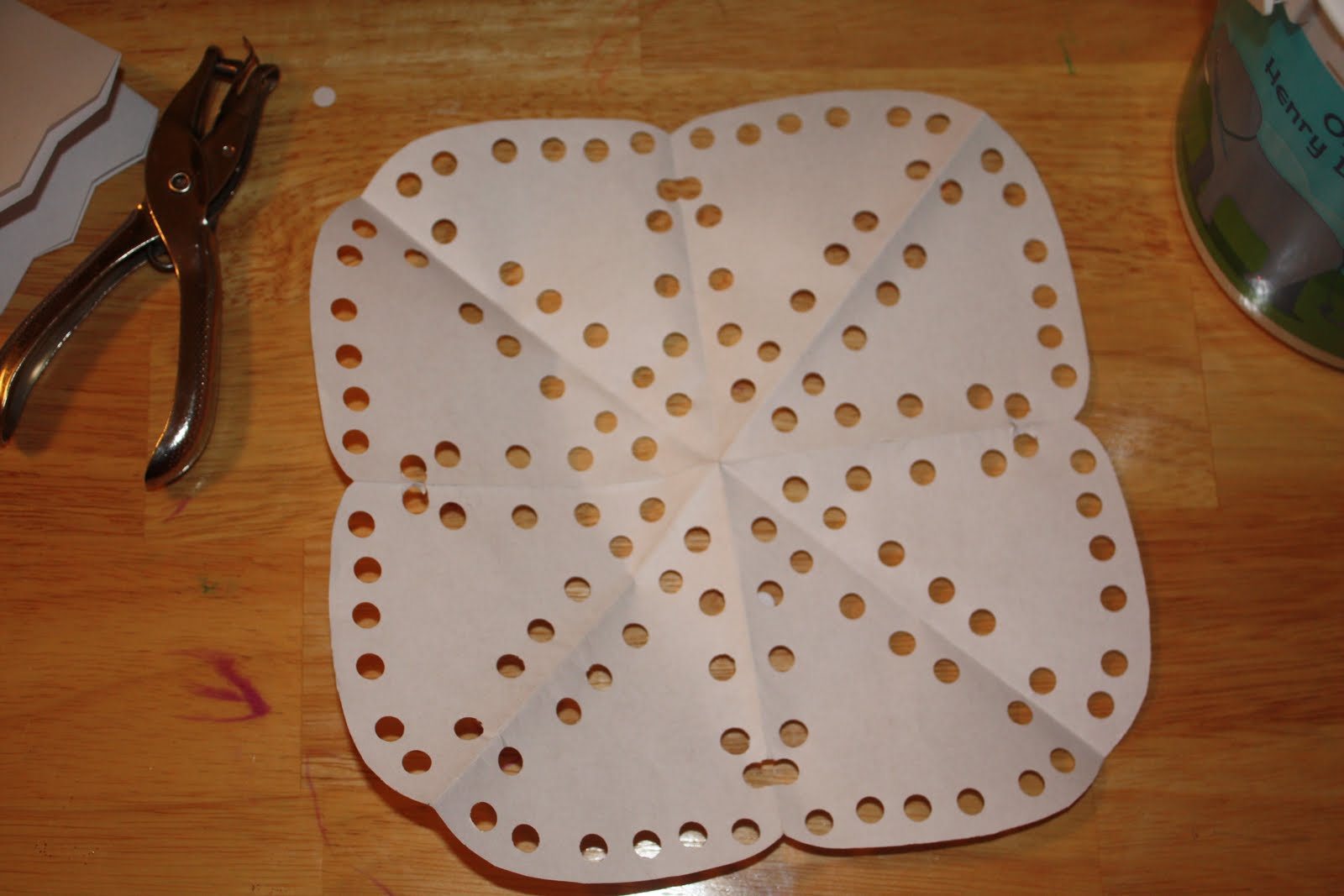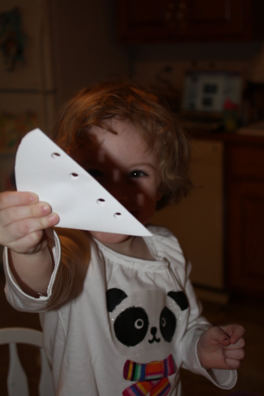 First, I took some computer paper (wishing I would've thought to pull from our recycle stash...who cares what is on the other side!), folded it in half twice then into a triangular shape. I cut off the excess/did a design on that end. I got several of these ready before we began.