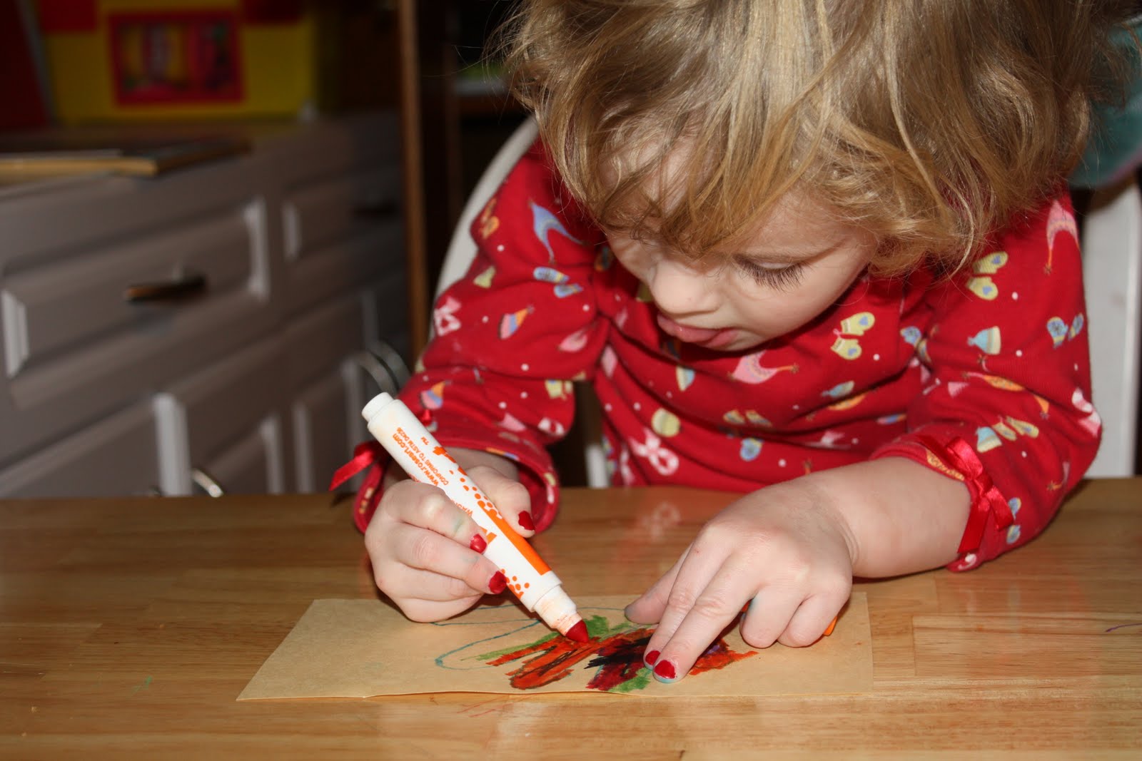 Supplies needed: Empty toilet paper or paper towel holder, wax paper, rubber band, decorating supplies (we used construction paper and markers, but could use foil, torn tissue paper glued to the roll, etc.)