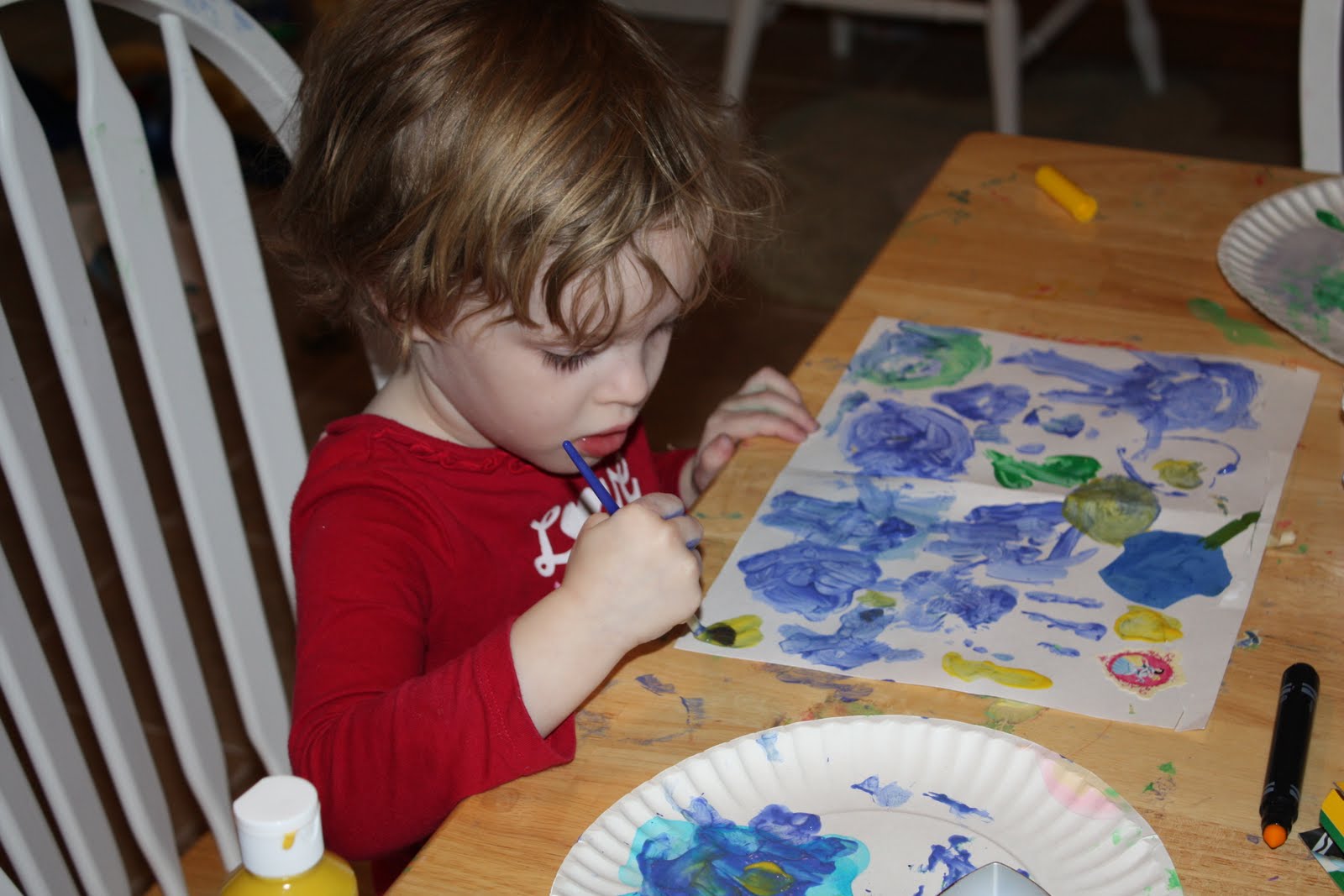Busy painting a card (at one time, there were faces on here but they have been buried by the handprints)