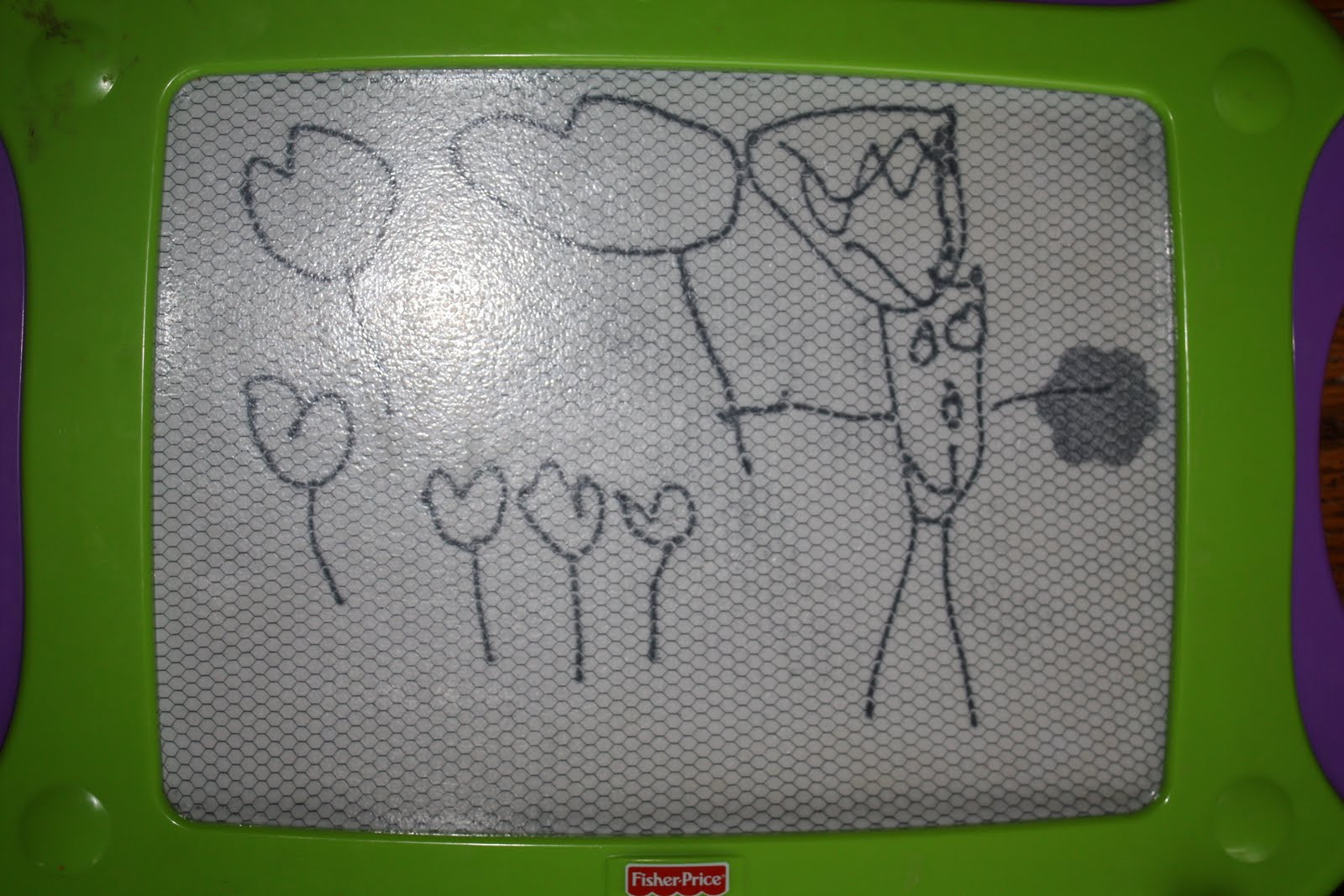 Daddy asked Big Sis to draw a car using her tub crayons, so this was her first car drawing! You can see the wheels, I think windows, and even the ground below (looks like train tracks).