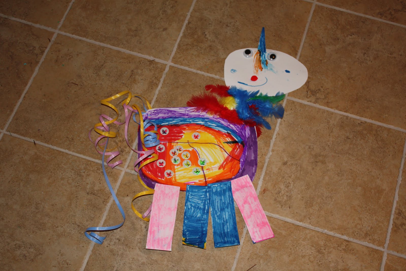 I used cardstock (8.5x11). First I cut out all the parts of the body: for the main body, I just rounded the edges of one sheet of cardstock. The legs were made from about half a sheet of cardstock and the head was formed out of the other half. Also cut out a small rectangle for the neck and cut out the unicorn horn. (We didn't place ears on it due to some time issues.)