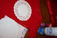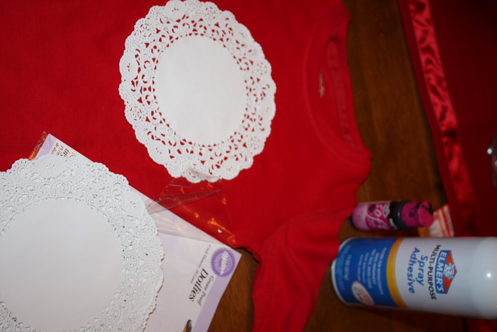 I opted to use a light coat of spray adhesive on the t-shirt, waited about 5 minutes, then placed a doily in the center of the shirt.