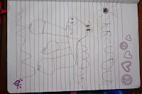 She had Mommy, Daddy, Little Sis and Little Sis' bear pose for a family portrait on the stairs. (Little sis is in Mommy's lap and bear is in between us...Little Sis got impatient, so the drawing was rushed after Daddy's picture was complete!)