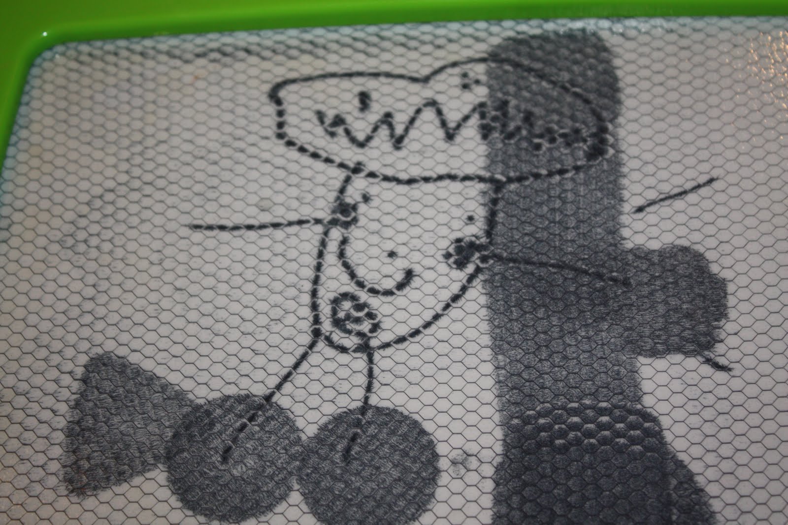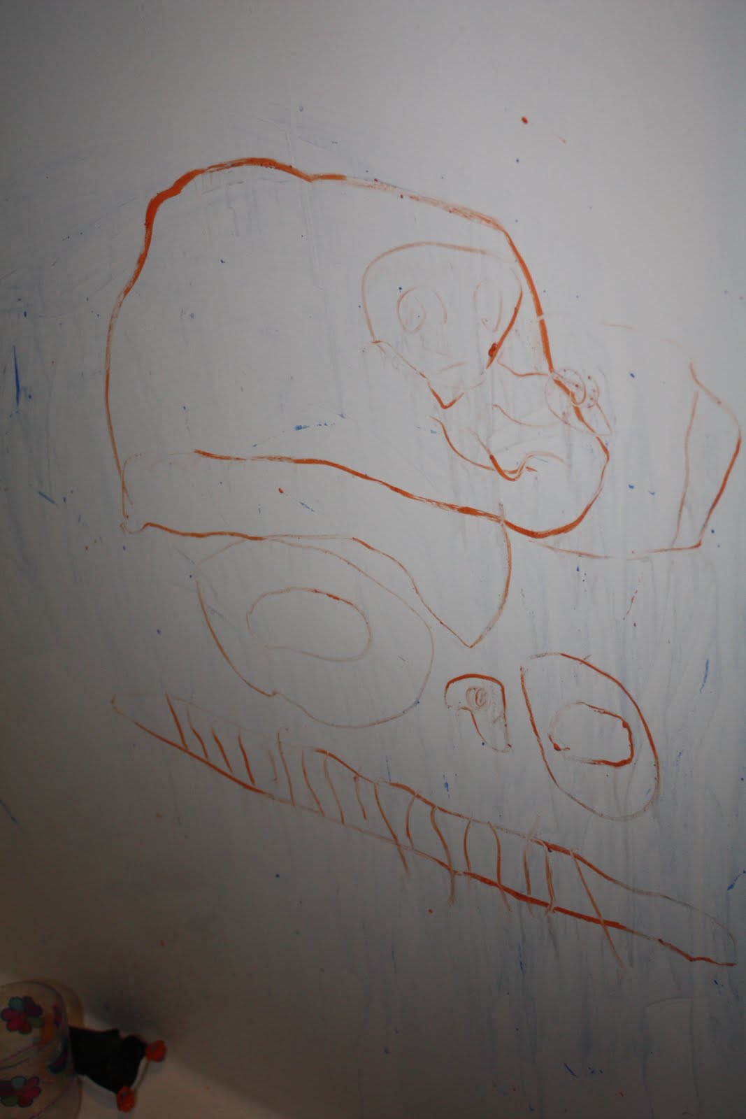 Daddy asked Big Sis to draw a car using her tub crayons, so this was her first car drawing! You can see the wheels, I think windows, and even the ground below (looks like train tracks).